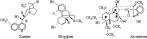 Открытие некоторых алкалоидов Начало химии алкалоидов обычно относят к 1803, когда Л.-Ш. Деронь выделил из опиума – высохшего на воздухе млечного сока снотворного (опийного) мака Papaver somniferum – смесь алкалоидов, которую он назвал наркотином. Затем в 1805 Ф.Сертюрнер сообщил о выделении морфина из опиума. Он приготовил несколько солей морфина и показал, что именно морфином обусловливается физиологическое действие опиума. Позднее (1810) Б.Гомес обработал спиртовый экстракт коры хинного дерева щелочью и получил кристаллический продукт, который назвал “цинхонино”. П. Пельтье и Ж. Кавенту на фармацевтическом факультете Сорбонны (1820) выделили из “цинхонино” два алкалоида, названные хинином и цинхонином. Позднее исследователи получили более двух десятков оснований из экстрактов коры хинного дерева и растений рода ремиджия (Remijia)сем. мареновых. Между 1820 и 1850 было выделено и описано большое число алкалоидов новых разнообразных типов. Среди них аконитин из растений рода аконит (Aconitum, борец) – одно из наиболее токсичных веществ растительного происхождения; атропин – оптически неактивная форма гиосциамина и мощное мидриатическое средство (даже 4*10–6 г вызывают расширение зрачка); колхицин – алкалоид безвременника осеннего, применяемый при лечении подагры; кониин представляет особый исторический интерес, поскольку именно он стал орудием казни Сократа в 399 до н.э., когда великий философ был вынужден выпить чашу с настоем болиголова (Conium maculatum); кодеин – близкий к морфину алкалоид, являющийся ценным обезболивающим и противокашлевым средством; пиперин – алкалоид черного перца (Piper nigrum); берберин – алкалоид из корней барбариса обыкновенного (Berberis vulgaris); стрихнин – очень ядовитый алкалоид,содержащийся в семенах чилибухи (Strychnos nux-vomica) и используемый при некоторых сердечных болезнях и для истребления грызунов; эметин содержится в корне ипекакуаны (Cephaelis ipecacuanha, рвотный корень) – рвотное и противопротозойное средство, применяется для лечения амебной дизентерии; кокаин содержится в листьях тропических растений рода Erythroxylum, главным образом в коке (E. coca), используется в медицине как местноанестезирующее средство: