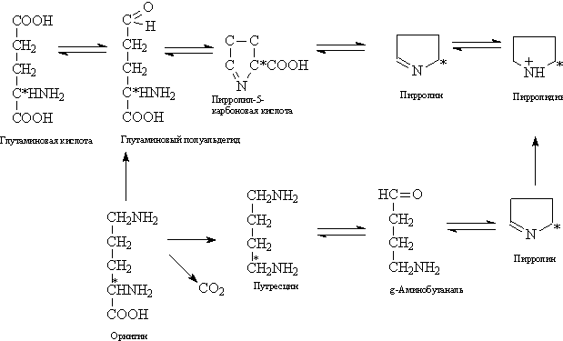 В основе биосинтеза алкалоидов лежит образование соответствующих гетероциклов. Исходными веществами для образования гетероциклов, содержащих азот, являются аминокислоты или продукты их декарбоксилирования - амины. Приведем конкретные схемы образования ряда гетероциклов на основании опытов по кормлению растений мечеными аминокислотами. Меченые атомы углерода обозначены звездочками. Глутаминовая кислота и орнитин служат источниками образования пирролидина: