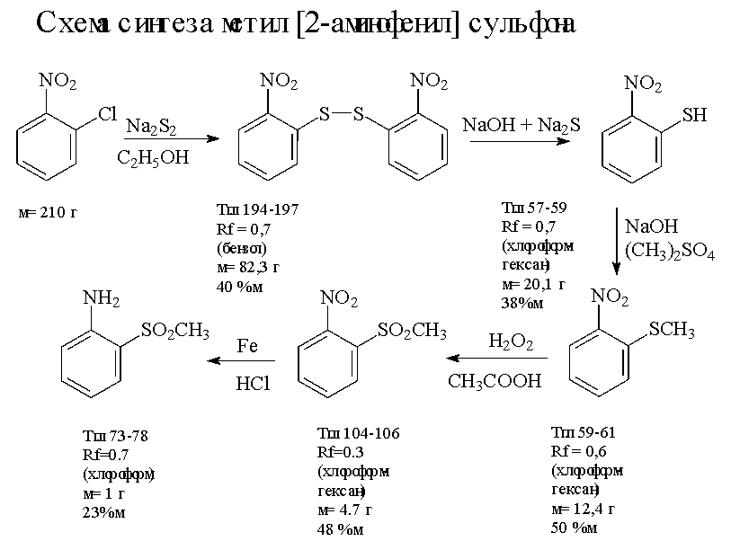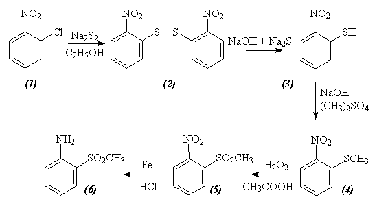 Целью данной работы является получение целевого продукта - метил [2-амино-фенил] сульфона, который может быть использован в качестве исходного соединения в синтезе азокрасителей. На кафедре проводились работы со сходными веществами, например получение N,N-диметиламида и N,N-диэтиламида ортаниловой кислоты исходя из 2-хлорнитробензола , через дисульфид, с дальнейшим исследованием кинетики азосочетания N,N-диалкиламидов ортаниловой кислоты с N-ацетил-И-кислотой проводилось Смирновой Т.