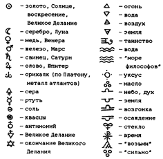 Глава №3. Символика алхимических веществ. Алхимики использовали в своей деятельности различные металлы и вещества, каждому из которых соответствовал свой символ или знак. Однако надо учитывать, что в своих трактатах они описывали эти вещества различно, причем зачастую в одном и том же трактате одно и тоже вещество называлось по-разному. Это, прежде всего, относится к трем основным веществам используемых в делании: первовеществу, тайному огню и философской ртути. Первичная материя. Первичная материя - для алхимика это не сама материя, а скорее ее возможность, сочетающая в себе все качества и свойства присущие материи. Дань ее описание можно только в противоречивых понятиях т.к. Первичная материя - это то, что остается от предмета когда он лишен всех своих характеристик. Первовещество - вещество наиболее близкое к Первичной материи по своим свойствам. В качестве примера ниже приведен ряд символических характеристик Первовещества: Первовещество - это (мужское) вещество становящаяся Единым и неповторимым в соединении с женским. Все его составляющие одновременно стабильны и изменчивы. Это вещество уникально, бедный им владеет в той же степени что и богатый. Оно известно каждому и не распознается ни кем. В своем невежестве обычный человек считает его мусором продает по дешевке, хотя для философов это наивысшая ценность. Далее Первовещество - это не однородная субстанция оно (Первовещест) состоит из двух компонентов: "мужского" и "женского". С химической точки зрения один из компонентов металл, другой же минерал содержащий ртуть. (Хотя кто его знает?.) Пожалуй, это определение достаточно универсально, и для изучения Мистической алхимии оно вполне самодостаточно. Философская ртуть. Философская ртуть - душа материи (тела вещества), она есть идеальное вещество, связывающее Дух и Тело в единое целое путем примирения в себе противоположностей Духа и Тела в себе, и служит принципом единства всех трех планов Бытия. По этому Философская ртуть чаще всего изображалась в виде гермафродита. Тайный огонь. Тайный огонь - реагент, с помощью которого идет воздействие на первовещество Философской ртути.