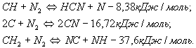 Образование “быстрых” оксидов азота. Для получения равновесных концентраций NO при горении стехиометрической метановоздушной смеси требуется период времени около10^-2---10^-3 с, однако время горения составляет 10^-4 с. Вместе с тем в углеводородных пламенах в отличие от пламен Н2 и СО непосредственно в зоне горения обнаруживается достаточно высокие концентрации NO. С. Фенимор на основание ряда реакций сделал предположение, что быстрое образование NO объясняется связыванием молекул азота радикалами СН и С2 в реакциях с очень малыми энергетическими затратами: