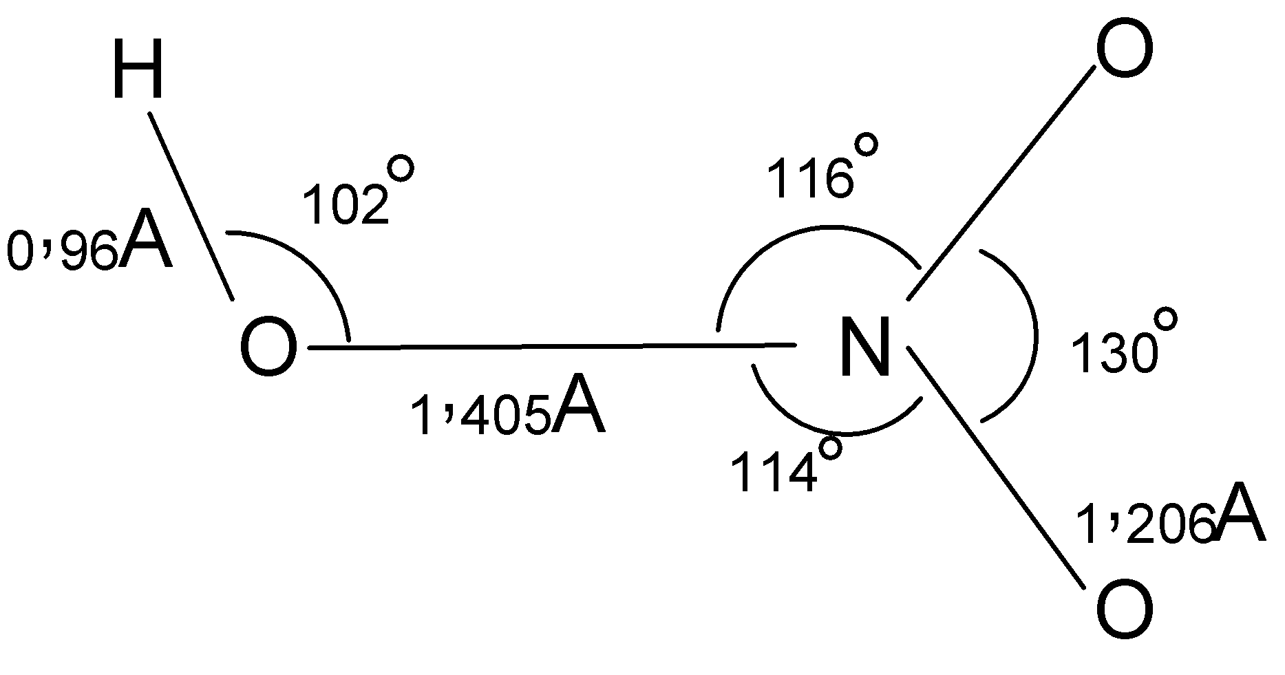 В газовой фазе молекула азотной имеет плоское строение. Вращение группы ОН относительно NO