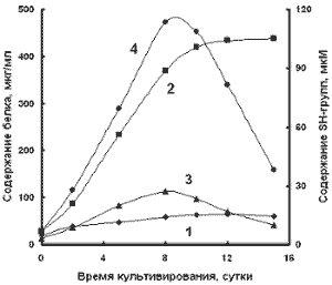 Рис. 3. Зависимость содержания низкомолекулярных белков (1, 2) и SH-групп (3, 4) в среде от возраста культуры Ps. diminuta . 1, 3 - контроль; 2, 4 - в присутствии 100 мг/л ванадата. Как видно из рис. 3 в среде культивирования Ps. diminuta наблюдается накопление низкомолекулярных белков, содержание которых к 12 суткам составляет около 50 мкг/мл (кривая 1). В присутствии ванадата количество белка к этому периоду времени возрастает до 450 мкг/мл (кривая 2). Это согласуется с ранее полученными данными о стимуляции синтеза МТ у цианобактерий (Лебедева и др., 1993; Саванина и др., 1995) и в клетках животных организмов (Gachot et al., 1994). Подобным образом ванадат стимулирует накопление SH-групп низкомолекулярных белков и, возможно, других тиолсодержащих соединений в среде культивирования Ps. diminuta (рис. 3, кривые 3 и 4); зависимости содержания SH-групп в среде от возраста культуры имеют колоколообразный характер с максимумом, приходящимся на 8-9 сутки. Кажущееся несоответствие характеров накопления SH-групп и белка в среде (наличие спада в содержании SH-групп, тогда как по белку такого спада нет), может быть обусловлено окислением SH-групп кислородом, которое должно значительно усиливаться при значениях pH выше 7, как это показано ранее для цистеина (Barsky et al., 1984). Действительно, в соответствии с нашими данными pH культуры Ps. diminuta с возрастом увеличивается от 7 до 8,5; в присутствии ванадата величины pH на 0,3-0,5 единицы выше, чем в контроле.