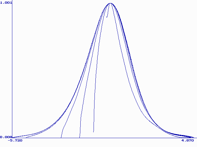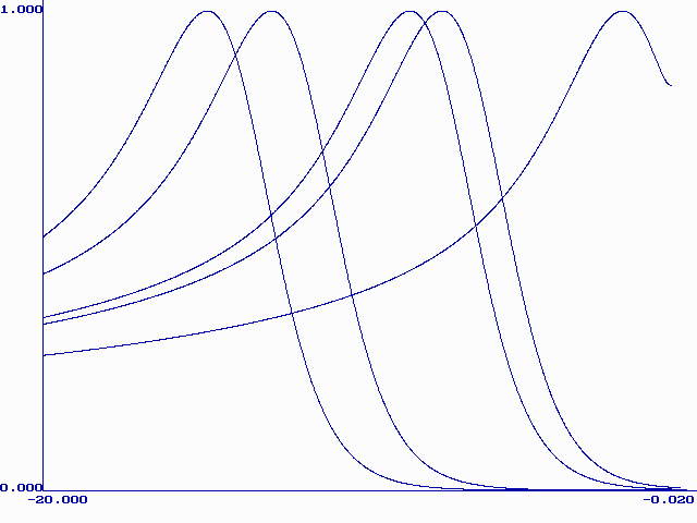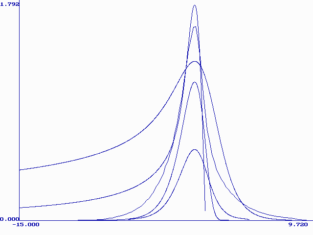 Модель М. Никольсон описывает форму вольтамперной кривой при растворении монослоя металла с поверхности твердого электрода. Кривая описывается уравнением (21) в интегральной форме. Форму вольтамперной кривой описывает первая производная функции y (bt). Были составлены таблицы значений y ў (bt) при разных значениях H. На рис. 3 приведены нормированные (все максимумы сведены в точку (0;1)) графики функции y ў (bt) при H=0.1, 1, 3, 10, 100, 1000, 10000, 170000. Из этого рисунка видно, что при больших H форма кривой становится постоянной. Высота максимума при Hі 100 почти не меняется (0.298± 0.002), а потенциал максимума смещается в область более положительных значений согласно уравнению (26):