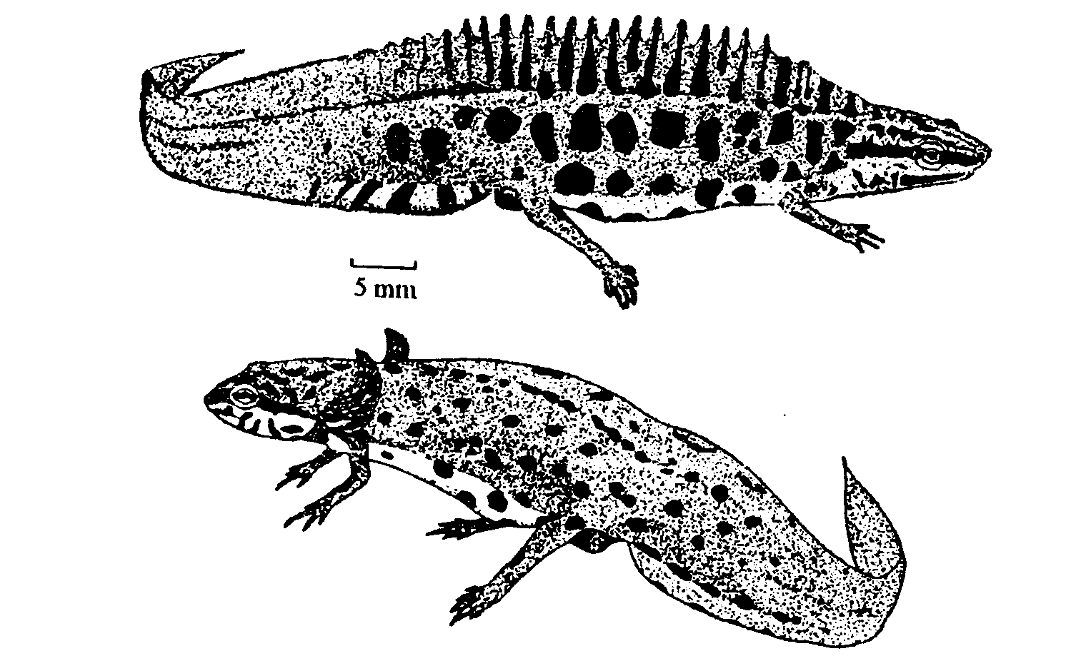 Рис. 5. Обычный (сверху) и неотенический (снизу) самцы обыкновенного тритона (Triturus vulgaris lantv)