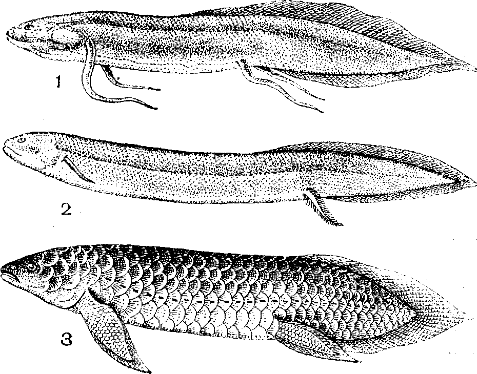 Двоякодышащие рыбы: 1 -— протоптер ; 2 — американский чешуйчатник; 3 — рогозуб издавая при этом характерный стонуще-хрюкающий звук, который далеко разносится по окрестности. Тотчас вслед за этим, сделав глубокий вдох, он медленно погружается на дно. И выдох и вдох производятся им через ноздри при плотно сомкнутых челюстях. Нельзя не признать, что при дыхании атмосферным воздухом действия рогозуба напоминают действия китообразных. Даже находясь в воде, содержащей достаточное количество кислорода, рогозуб, по-видимому, не может довольствоваться жаберным дыханием и дополняет его дыханием легочным. Последнее особенно полезно для него в засушливые сезоны, когда русла рек полностью пересыхают на больших пространствах и когда вода сохраняется лишь в наиболее глубоких ямах (бочагах). В таких постепенно усыхающих убежищах, ища спасения, скапливается множество рыб, и в том числе рогозубы. Когда в перегретой стоячей воде в результате гнилостных процессов исчезает почти весь кислород и все остальные рыбы дохнут от удушья, рогозуб продолжает благоденствовать, перейдя на дыхание атмосферным воздухом. И даже тогда, когда при затянувшейся засухе эти убежища превращаются в кладбище для всего живого, а вода в них — в зловонную жижу, в которой разлагаются сотни трупов погибших животных,— даже и тогда рогозуб выживает, дождавшись спасительных дождей. Однако полное высыхание водоема гибельно и для него, так как он не может впадать в спячку, зарывшись в грунт, подобно своим африканским и южноамериканскому сородичам. Вытащенный из воды рогозуб совершенно беспомощен и погибает скорее, чем многие другие рыбы, лишенные легких. Рогозуб — вялое и малоподвижное животное.Большую часть времени он обычно проводит на дне глубоких омутов, где лежит на брюхе или стоит, опираясь на парные плавники и на хвостовую часть тела. В поисках пищи он медленно ползает на брюхе, а подчас и ходит, опираясь на те же парные плавники. В толще воды он, как правило, медленно передвигается за счет едва заметных изгибаний своего тела. Только если его вспугнуть, рогозуб пускает в ход свой мощный хвост и выказывает свою способность к быстрому движению. Судя по всему, суточный ритм у этого животного выражен слабо и нередко рогозуб проявляет свою вялую активность в любое время дня и ночи. Его пищу составляют различные беспозвоночные (моллюски, ракообразные, личинки насекомых, черви и т. п.). Правда, кишечник рогозуба обычно набит мелко пережеванными растительными остатками, но, по всей видимости, растительная пища им не усваивается, а захватывается вместе с беспозвоночными животными. По крайней мере в неволе он безо всякого ущерба довольствуется “скоромной” пищей, не выказывая потребности в “вегетарианской” диете. Нерест рогозуба сильно растянут и продолжается с апреля по ноябрь. Наиболее интенсивно он идет в сентябре —октябре, когда наступает период дождей, реки вздуваются и вода в них хорошо аэрируется. Рогозуб откладывает икру на водную растительность и не проявляет дальнейшей заботы о потомстве. Так как оболочка у икринок не клейкая, то многие из них скатываются и падают на дно; не совсем ясно, как это сказывается на их выживании. Икринки довольно крупные, они достигают в диаметре 6,5—7,0 мм и заключены в студенистую оболочку, что делает их весьма сходными с лягушачьей икр