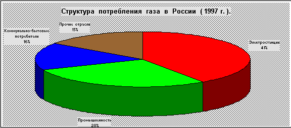 В 1997 г. народному хозяйству России поставлено 336 млрд.м 3 . газа, в том числе предприятиями РАО “Газпром” - 301,3 млрд.м 3 . газа. Наиболее значительным и стабильным потребителем газа в России является электроэнергетический сектор, где за последние годы произошла переориентация значительной части централизованного производства тепла и электроэнергии на использование газа. В общем объёме потребления доля электроэнергетики составляет 40,5%. Роль основного потребителя газа в России всё больше приобретает коммунально-бытовой сектор, доля которого в общем объёме потребления в 1997 г. составила 16,2%. Одна из основных задач компании - довести до мирового уровня потребление газа в коммунально-бытовом секторе.