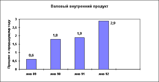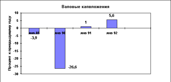 рис. 1. Личное потребление в 1992г. было ниже уровня 1986г. почти на 3%. Валовые капиталовложения значительно уступают показателям 1988г. Импорт в 1992г. был ниже, чем в 1986г., на 3,5%, а объём производства и обрабатывающей промышленности - даже ниже уровня 1985г. Эта безрадостная картина скрадывалась лишь благодаря добыче нефти. Объём валовых капвложений показан на рис. 2.
