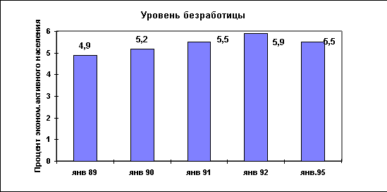 рис. 2. Уровень инфляции постепенно понижался и в мае 1993г. составил в годовом исчислении 2,4%, а в 1994г. 1,7%. Но уровень издержек на заработную плату был по-прежнему заметно выше, чем в других странах, хотя конкурентоспособность норвежских товаров в 1993г. на 11% превысила уровень 1988г. Дефицит государственного бюджета по-прежнему велик -50 млрд. крон в 1993г. К весне 1993г. заметно снизился уровень процентных ставок, приостановилось падение занятости. За первые пять месяцев 1993г. экспорт составил 88 млрд. крон, а импорт 60 млрд. крон. На нефть приходится 43% всего норвежского товарного экспорта. Банковский кризис в стране продолжается пятый год, хотя самое худшее уже позади. Все крупные коммерческие банки, кроме “Ден Норске банк” , оказались в полной зависимости от государства. Банковский кризис начался с драматического падения цен на нефть и распространился на все другие секторы экономики. 1994 год положил начало оживлению экономики. ВВП вырос на 3,5%. Инфляция составила мене 1%. Платежный баланс связан с большим активным сальдо, превысившим 2,5% ВВП. Безработица утвердилась на уровне 5,5% экономически активного населения страны. Уровень безработицы с 1989 по 1995 года характеризует рис. 3.